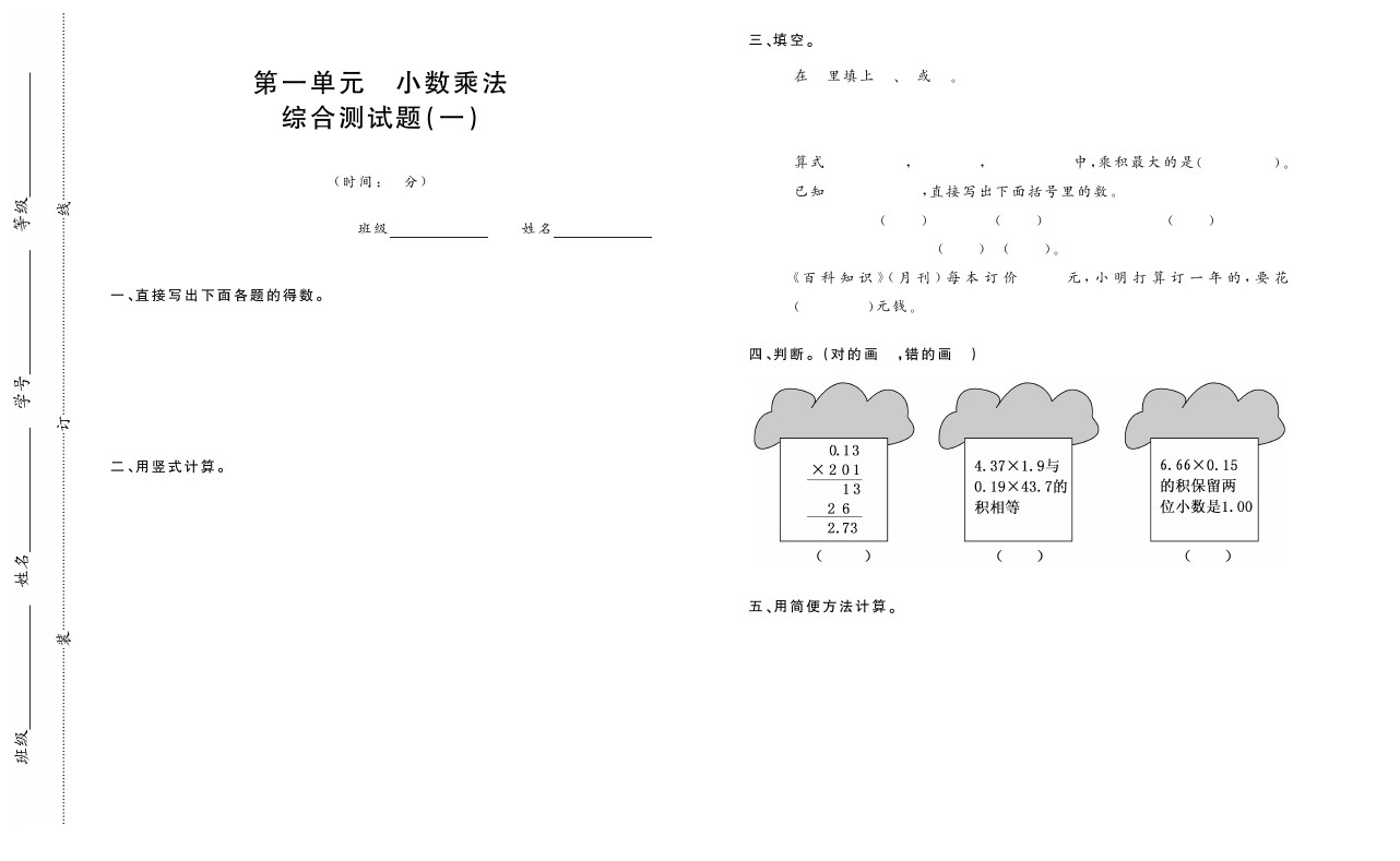 小学数学单元综合测试题五(上)